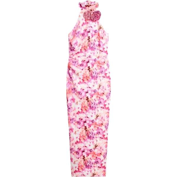Abito da donna con stampa fiori e scollo halterneck con laccetti da annodare al collo. Corpetto con arricciatura elasticizzata che valorizza la silhouette e gonna svasata dal movimento leggero in lunghezza mini. Ideale con sandali e borsa a mano per giornate estive, aperitivi o vacanze.