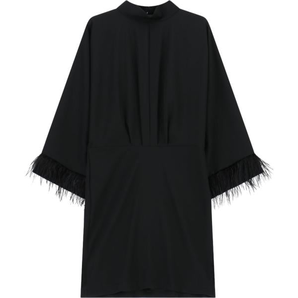 Pantaloni skinny da donna in nero pece modellante con zip in cotone Freddy, Maglione da donna in nero pece collo alto a maniche lunghe in cotone Lauren, Collana da donna in beige sabbia con perle Lauren, Décolleté da donna in nero pece effetto scamosciato con tacco squadrato a punta in pelle Lauren, Vestito corto da donna in marrone chiaro collo con revers corto Dixie, Borsa a mano da donna in nero pece in velluto Lauren.
