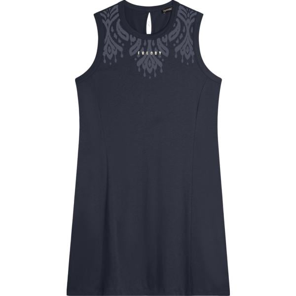 Un vestito dalla vestibilità regolare in jersey leggero con taglio dritto e lunghezza media. Il design minimalista è arricchito da un classico scollo girocollo maniche corte e una grafica con logo FREDDY impreziosita da perline dorate sul fronte ideale per un look sofisticato ma comodo.