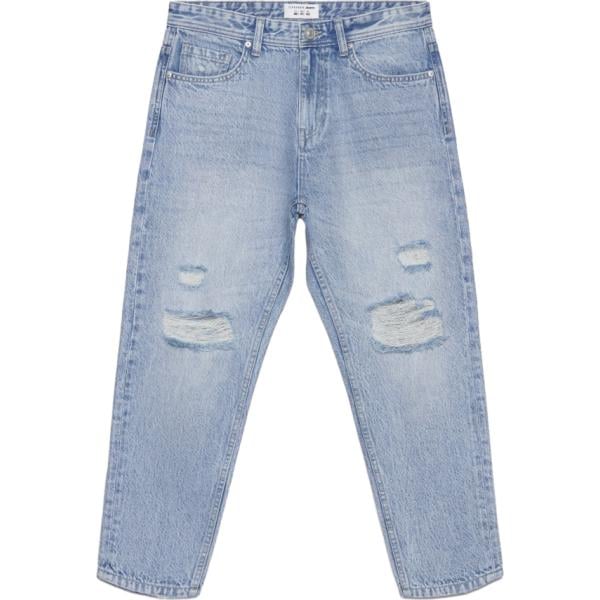 Jeans strappati da uomo in azzurro effetto strappato cinque tasche con zip in denim