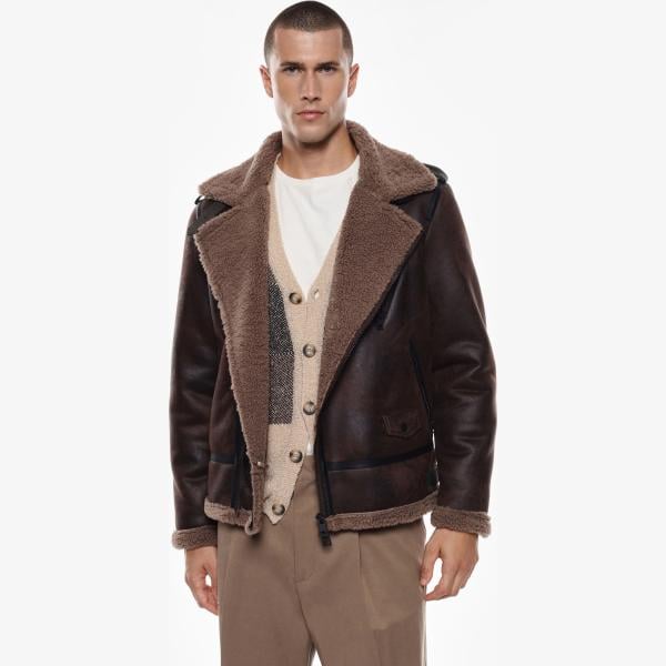 Giacca soprabito da uomo in marrone scuro con zip in montone