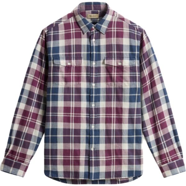 Camicia da uomo in viola chiaro Doppelganger, Pantaloni chino da uomo in verde oliva Imperial, Sneakers da uomo in marrone chiaro Imperial, Giacca soprabito da uomo in grigio chiaro a quadri in cotone Doppelganger.