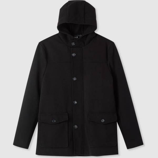 Cappotto da uomo in nero pece collo con cappuccio con bottoni