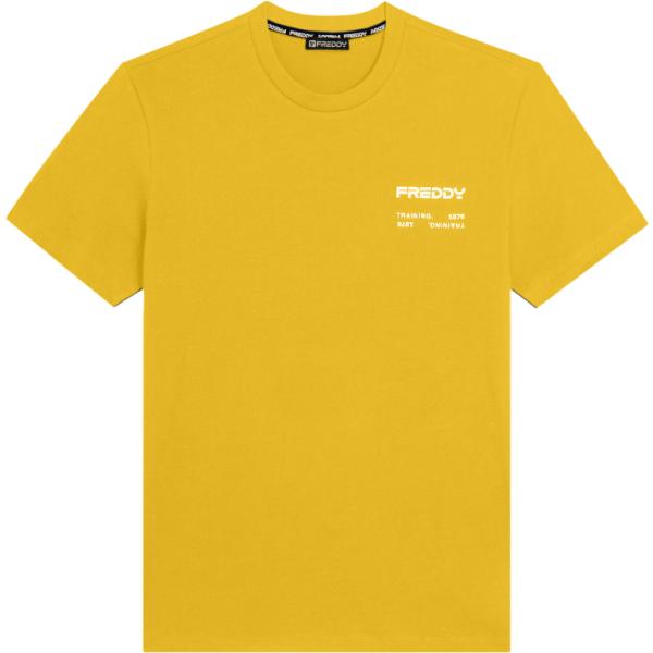 T-shirt sportiva da uomo in giallo scuro con stampe con scollo a maniche corte in cotone