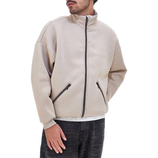 Stivaletti da uomo in marrone scuro Canguro, Bomber da uomo in beige sabbia effetto scamosciato a maniche lunghe con zip Terranova, Felpa da uomo in marrone scuro collo senza cappuccio a maniche lunghe con zip Terranova, Pantaloni da uomo in marrone scuro con coulisse Terranova.
