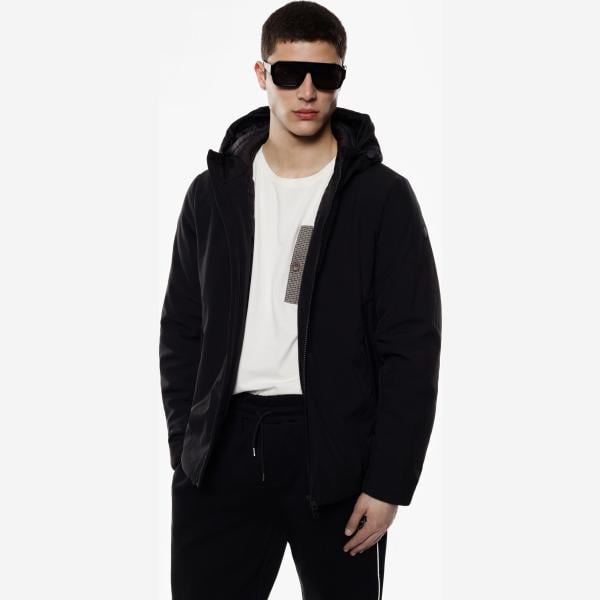 Giacca soprabito da uomo in nero pece collo con cappuccio con zip in pile