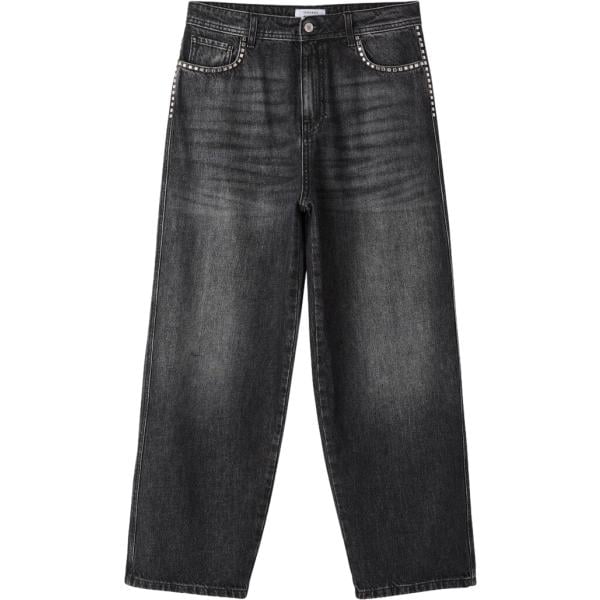Jeans da uomo in nero pece con borchie cinque tasche con zip in denim