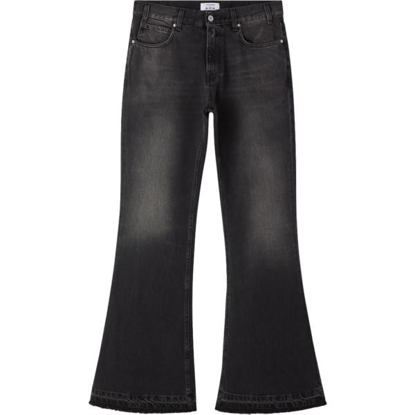 Jeans da uomo forma svasata in nero pece con frange cinque tasche a vita media con zip in denim