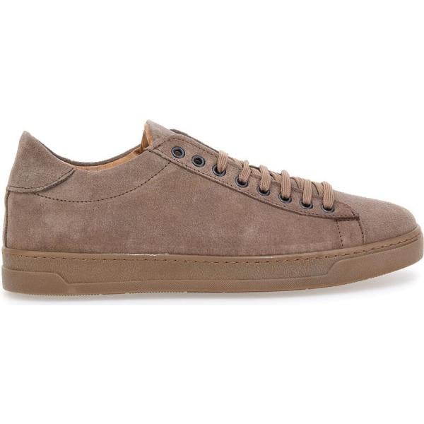 Sneakers da uomo in marrone chiaro effetto scamosciato con lacci Skechers, Pantaloni da uomo in marrone scuro a vita bassa con zip in cotone Jasper Reed, Cintura da uomo in marrone scuro con fibbia Imperial, T-shirt da uomo in bianco neve con stampe a maniche corte Imperial, Maglione da uomo in marrone scuro girocollo in cotone Doppelganger.